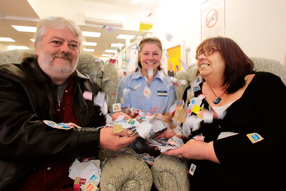 On Wednesday, Sally from our Worthing branch presented Sue and Howard who collect stamps for the RNIB with the final collection of stamps, totalling over 17,000! These stamps are sorted by volunteers like Howard and Sue and then sold in large batches at special auctions up in London with all proceeds going to the charity.
